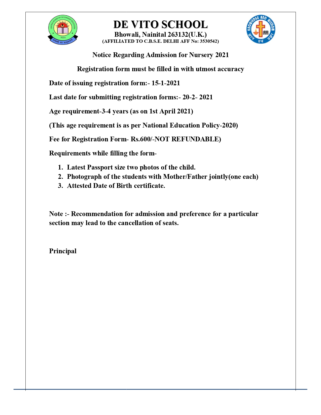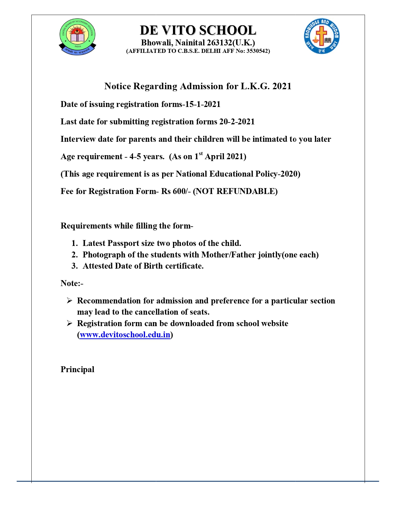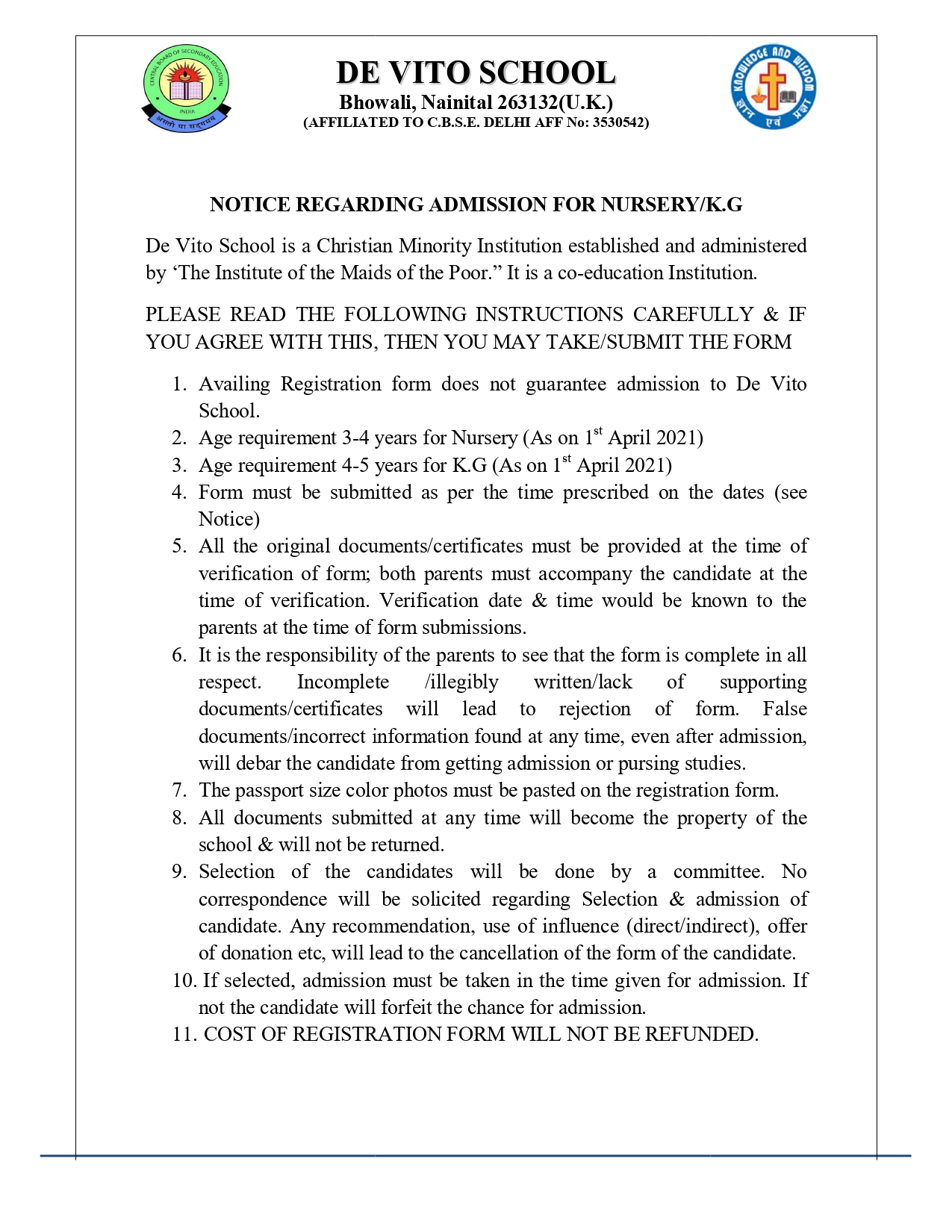 NOTICE REGARDING ADMISSION FOR NURSERY/KG
